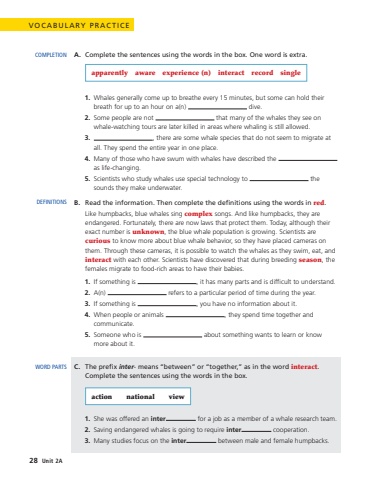 A.Complete the sentences using the words in the box. One word is extra.apparentlyawareexperience (n)interactrecordsingle1.Whales generally come up to breathe every 15 minutes, but some can hold their breath for up to an hour on a(n) dive.2.Some people are not that many of the whales they see on whale-watching tours are later killed in areas where whaling is still allowed.3., there are some whale species that do not seem to migrate at all. They spend the entire year in one place.4.Many of those who have swum with whales have described the as life-changing.5.Scientists who study whales use special technology to the sounds they make underwater.B. Read the information. Then complete the definitions using the words in redLike humpbacks, blue whales sing complex songs. And like humpbacks, they are endangered. Fortunately, there are now laws that protect them. Today, although their exact number is unknown, the blue whale population is growing. Scientists are curious to know more about blue whale behavior, so they have placed cameras on them. Through these cameras, it is possible to watch the whales as they swim, eat, and interact with each other. Scientists have discovered that during breeding seasonfemales migrate to food-rich areas to have their babies.1.If something is , it has many parts and is difficult to understand.2.A(n) refers to a particular period of time during the year.3.If something is , you have no information about it.4.When people or animals , they spend time together and communicate.5.Someone who is about something wants to learn or know more about it.COMPLETIONDEFINITIONSVOCABULARY PRACTICEC.The prefix inter- means %u201cbetween%u201d or %u201ctogether,%u201d as in the word interact. Complete the sentences using the words in the box.actionnationalview1.She was offered an inter for a job as a member of a whale research team. 2.Saving endangered whales is going to require inter cooperation. 3.Many studies focus on the inter between male and female humpbacks.WORD PARTS28Unit 2A