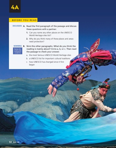 BEFORE YOU READA.Read the first paragraph of the passage and discuss these questions with a partner.1.Can you name any other places on the UNESCO World Heritage sites list?2.Why do you think many of these places and areas need protection?B.Skim the other paragraphs. What do you think the reading is mainly about? Circle a, b, or c. Then read the passage to check your answer.a.the most famous UNESCO World Heritage sitesb.a UNESCO list for important cultural traditionsc.how UNESCO has changed since it first beganSKIMMINGReview this reading skill in Unit 1ADISCUSSION54Unit 4A