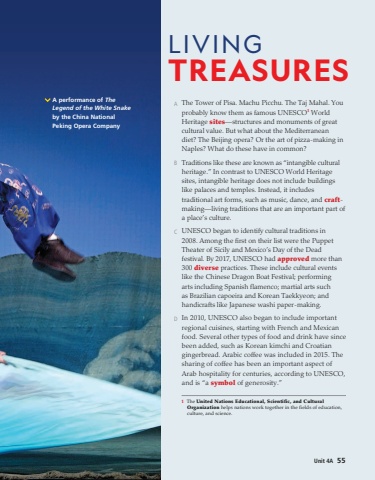 LIVINGTREASURESAB CDThe Tower of Pisa. Machu Picchu. The Taj Mahal. You probably know them as famous%u00a0UNESCO1 World Heritage sites%u2014structures and monuments of great cultural value. But what about the%u00a0Mediterranean diet? The%u00a0Beijing opera? Or the art of pizza-making in Naples? What do these have in common?Traditions like these are known as %u201cintangible cultural heritage.%u201d In contrast to UNESCO World Heritage sites, intangible heritage does not include buildings like palaces and temples. Instead, it includes traditional art forms, such as music, dance, and craftmaking%u2014living traditions that are an important part of a place%u2019s culture. UNESCO began to identify cultural traditions in 2008. Among the first on their list were the Puppet Theater of Sicily and Mexico%u2019s%u00a0Day of the Dead festival. By 2017, UNESCO had approved more than 300 diverse practices. These include cultural events like the Chinese Dragon Boat Festival; performing arts including Spanish flamenco; martial arts such as Brazilian capoeira and Korean Taekkyeon; and handicrafts like Japanese washi paper-making.In 2010, UNESCO also began to include important regional cuisines, starting with French and Mexican food. Several other types of food and drink have since been added, such as Korean kimchi and Croatian gingerbread. Arabic coffee was included in 2015. The sharing of coffee has been an important aspect of Arab hospitality for centuries, according to UNESCO, and is %u201ca symbol of generosity.%u201d A performance of The Legend of the White Snakeby the China National Peking Opera Company1The United Nations Educational, Scientific, and Cultural Organization helps nations work together in the fields of education, culture, and science.Unit 4A