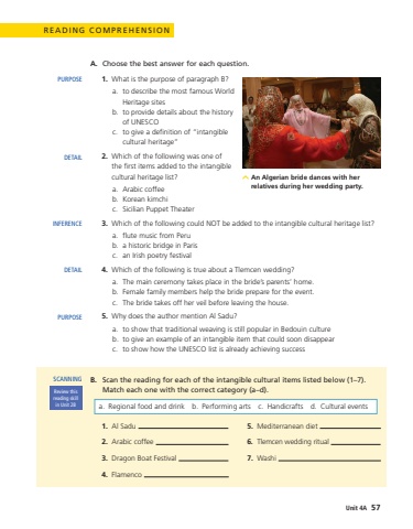 READING COMPREHENSIONA.Choose the best answer for each question.1.What is the purpose of paragraph B?a.to describe the most famous World Heritage sitesb.to provide details about the history of UNESCOc.to give a definition of %u201cintangible cultural heritage%u201d 2.Which of the following was one of the first items added to the intangible cultural heritage list?a.Arabic coffeeb.Korean kimchic.Sicilian Puppet Theater3.Which of the following could NOT be added to the intangible cultural heritage list?a.flute music from Perub.a historic bridge in Parisc.an Irish poetry festival4.Which of the following is true about a Tlemcen wedding?a.The main ceremony takes place in the bride%u2019s parents%u2019 home.b.Female family members help the bride prepare for the event.c.The bride takes off her veil before leaving the house.5.Why does the author mention Al Sadu?a.to show that traditional weaving is still popular in Bedouin cultureb.to give an example of an intangible item that could soon disappearc.to show how the UNESCO list is already achieving successB.Scan the reading for each of the intangible cultural items listed below (1%u20137). Match each one with the correct category (a%u2013d).1.Al Sadu 2.Arabic coffee 3.Dragon Boat Festival 4.Flamenco 5.Mediterranean diet 6.Tlemcen wedding ritual 7.Washi PURPOSEDETAILINFERENCEDETAILPURPOSEReview this reading skill in Unit 2BSCANNINGAn Algerian bride dances with her relatives during her wedding party.a.Regional food and drinkb.Performing artsc.Handicraftsd.Cultural events Unit 4A