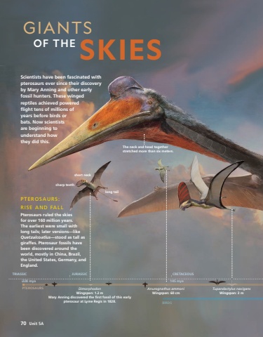 GIANTSOF THESKIESScientists have been fascinated with pterosaurs ever since their discovery by Mary Anning and other early fossil hunters. These winged reptiles achieved powered flight tens of millions of years before birds or bats. Now scientists are beginning to understand how they did this.PTEROSAURS: RISE AND FALLPterosaurs ruled the skies for over 160 million years. The earliest were small with long tails; later versions%u2014like Quetzalcoatlus%u2014stood as tall as giraffes. Pterosaur fossils have been discovered around the world, mostly in China, Brazil, the United States, Germany, and England.The neck and head together stretched more than six meters.TRIASSICPTEROSAURSBIRDSJURASSICDimorphodonWingspan: 1.2 mMary Anning discovered the first fossil of this early pterosaur at Lyme Regis in 1828.short neckAnurognathus ammoniWingspan: 60 cm228 mya70Unit 5A