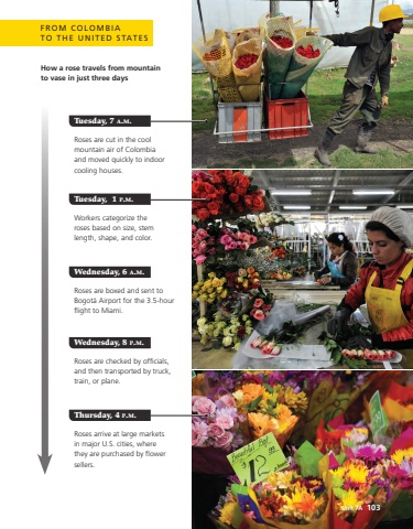 Tuesday, 7 a.m. Roses are cut in the cool mountain air of Colombia and moved quickly to indoor cooling houses.Tuesday, 1 p.m. Workers categorize the roses based on size, stem length, shape, and color.Wednesday, 6 Bogot%u00e1 Airport for the 3.5-hour flight to Miami.Wednesday, 8 p.m. Roses are checked by officials, and then transported by truck, train, or plane.Thursday, 4 p.m. Roses arrive at large markets in major U.S. cities, where they are purchased by flower sellers.How a rose travels from mountain to vase in just three daysFROM COLOMBIA TO THE UNITED STATES