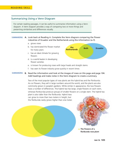 READING SKILLA.Look back at Reading A. Complete the Venn diagram comparing the flower industries of Ecuador and the Netherlands using the information (a%u2013f).a.grows rosesb.has dominated the flower market for many yearsc.has an ideal climate for growing flowersd.is a world leader in developing flower varietiese.is known for producing roses with large heads and straight stemsf.has seen its flower industry grow quickly in recent timesB.Read the information and look at the images of roses on this page and page 104. Add headings and make notes in the Venn diagram to create a summary.Two of the most popular types of rose plants are the hybrid tea and the floribunda. As cut flowers, they sell in large numbers around the world, and the plants are also commonly grown in people%u2019s gardens. While similar in appearance, the two flowers have a number of differences. The hybrid tea has large, single flowers on each stem, whereas floribundas produce groups of smaller flowers on a single stem. The hybrid tea plant is also taller than the floribunda. Hybrid teas can grow to more than two meters in height, but the floribunda rarely grows higher than one meter.SUMMARIZINGSUMMARIZINGSummarizing Using a Venn DiagramFor certain reading passages, it can be useful to summarize information using a Venn diagram. A Venn diagram provides a way of comparing two or more things and presenting similarities and differences visually. The flowers of a floribunda rose plantthe NetherlandsBoth EcuadorUnit 7A