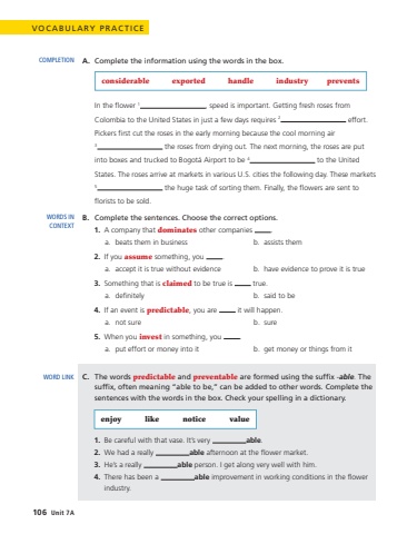 A.Complete the information using the words in the box.considerableexportedhandleindustrypreventsIn the flower 1, speed is important. Getting fresh roses from Colombia to the United States in just a few days requires 2 effort. Pickers first cut the roses in the early morning because the cool morning air 3 the roses from drying out. The next morning, the roses are put into boxes and trucked to Bogot%u00e1 Airport to be 4 to the United States. The roses arrive at markets in various U.S. cities the following day. These markets 5 the huge task of sorting them. Finally, the flowers are sent to florists to be sold.B.Complete the sentences. Choose the correct options.1.A company that dominates other companies .a.beats them in businessb.assists them2.If you assume something, you a.accept it is true without evidence b.have evidence to prove it is true3.Something that is claimed to be true is true.a.definitelyb.said to be4.If an event is predictable, you are it will happen.a.not sureb.sure5.When you invest in something, you .a.put effort or money into itb.get money or things from itCOMPLETIONWORDS IN CONTEXTVOCABULARY PRACTICEC.The words predictable and preventable are formed using the suffix -ablesuffix, often meaning %u201cable to be,%u201d can be added to other words. Complete the sentences with the words in the box. Check your spelling in a dictionary.enjoylikenoticevalue1.Be careful with that vase. It%u2019s very able.2.We had a really able afternoon at the flower market.3.He%u2019s a really able person. I get along very well with him.4.There has been a able improvement in working conditions in the flower industry.WORD LINK106Unit 7A