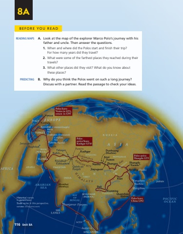BEFORE YOU READA.Look at the map of the explorer Marco Polo%u2019s journey with his father and uncle. Then answer the questions.1.When and where did the Polos start and finish their trip? For how many years did they travel?2.What were some of the farthest places they reached during their travels?3.What other places did they visit? What do you know about these places?B.Why do you think the Polos went on such a long journey? Discuss with a partner. Read the passage to check your ideas.READING MAPSPREDICTING116Unit 8A