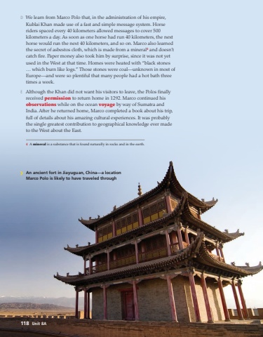 4A mineral is a substance that is found naturally in rocks and in the earth.We learn from Marco Polo that, in the administration of his empire, Kublai Khan made use of a fast and simple message system. Horse riders spaced every 40 kilometers allowed messages to cover 500 kilometers a day. As soon as one horse had run 40 kilometers, the next horse would run the next 40 kilometers, and so on. Marco also learned the secret of asbestos cloth, which is made from a mineral4 and doesn%u2019t catch fire. Paper money also took him by surprise, since it was not yet used in the West at that time. Homes were heated with %u201cblack stones %u2026 which burn like logs.%u201d Those stones were coal%u2014unknown in most of Europe%u2014and were so plentiful that many people had a hot bath three times a week.Although the Khan did not want his visitors to leave, the Polos finally received permission to return home in 1292. Marco continued his observations while on the ocean voyage by way of Sumatra and India. After he returned home, Marco completed a book about his trip, full of details about his amazing cultural experiences. It was probably the single greatest contribution to geographical knowledge ever made to the West about the East.DEAn ancient fort in Jiayuguan, China%u2014a location Marco Polo is likely to have traveled through118Unit 8A