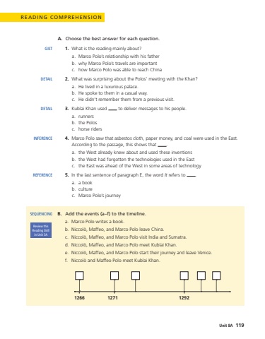 READING COMPREHENSIONA.Choose the best answer for each question.1.What is the reading mainly about?a.Marco Polo%u2019s relationship with his fatherb.why Marco Polo%u2019s travels are importantc.how Marco Polo was able to reach China2.What was surprising about the Polos%u2019 meeting with the Khan?a.He lived in a luxurious palace.b.He spoke to them in a casual way.c.He didn%u2019t remember them from a previous visit.3.Kublai Khan used to deliver messages to his people.a.runnersb.the Polosc.horse riders4.Marco Polo saw that asbestos cloth, paper money, and coal were used in the East. According to the passage, this shows that .a.the West already knew about and used these inventionsb.the West had forgotten the technologies used in the East c.the East was ahead of the West in some areas of technology5.In the last sentence of paragraph E, the word It refers to a bookb.culturec.Marco Polo%u2019s journey GISTDETAILDETAILINFERENCEREFERENCE126612711292Review this Reading Skill in Unit 3AB.Add the events (a%u2013f) to the timeline.a.Marco Polo writes a book.b.Niccol%u00f2, Maffeo, and Marco Polo leave China. c.Niccol%u00f2, Maffeo, and Marco Polo visit India and Sumatra.d.Niccol%u00f2, Maffeo, and Marco Polo meet Kublai Khan. e.Niccol%u00f2, Maffeo, and Marco Polo start their journey and leave Venice.f.Niccol%u00f2 and Maffeo Polo meet Kublai Khan.SEQUENCINGUnit 8A