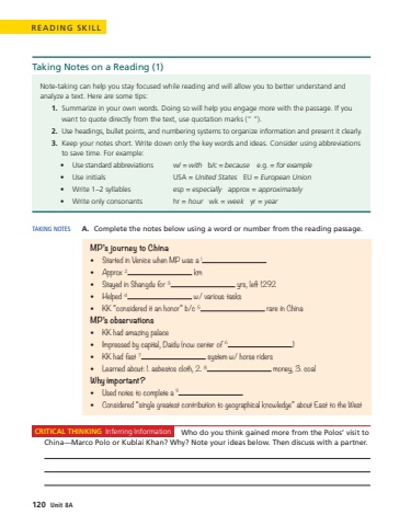 READING SKILLTaking Notes on a Reading (1)Note-taking can help you stay focused while reading and will allow you to better understand and analyze a text. Here are some tips:1.Summarize in your own words. Doing so will help you engage more with the passage. If you want to quote directly from the text, use quotation marks (%u201c %u201d).2.Use headings, bullet points, and numbering systems to organize information and present it clearly.3.Keep your notes short. Write down only the key words and ideas. Consider using abbreviations to save time. For example: %u2022Use standard abbreviationsw/ = with b/c = because e.g. = for example%u2022Use initialsUSA = United States EU = European Union%u2022Write 1%u20132 syllablesesp = especially approx = approximately%u2022Write only consonantshr = hour wk = week yr = yearCRITICAL THINKINGInferring InformationWho do you think gained more from the Polos%u2019 visit to China%u2014Marco Polo or Kublai Khan? Why? Note your ideas below. Then discuss with a partner. TAKING NOTESA.Complete the notes below using a word or number from the reading passage.MP%u2019s journey to China%u2022Started in Venice when MP was a %u2022Approx 2%u2022Stayed in Shangdu for 3%u2022Helped 4%u2022KK %u201cconsidered it an honor%u201d b/c MP%u2019s observations%u2022KK had amazing palace%u2022Impressed by capital, Daidu (now center of 6)%u2022KK had fast 7 system w/ horse riders%u2022Learned about: 1. asbestos cloth, 2. 8 money, 3. coalWhy important?%u2022Used notes to complete a 9%u2022Considered %u201csingle greatest contribution to geographical knowledge%u201d about East to the120Unit 8A