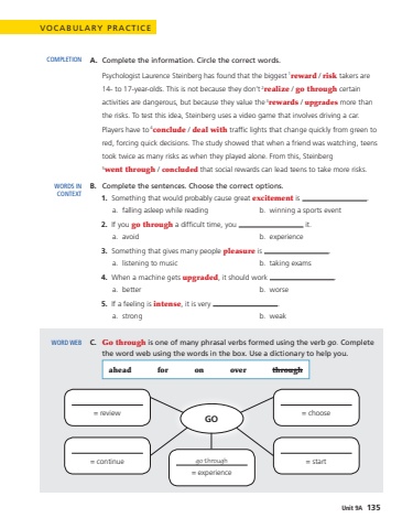 A.Complete the information. Circle the correct words.Psychologist Laurence Steinberg has found that the biggest 1reward / risk takers are 14- to 17-year-olds. This is not because they don%u2019t 2realize / go through certain activities are dangerous, but because they value the 3rewards / upgrades more than the risks. To test this idea, Steinberg uses a video game that involves driving a car. Players have to 4conclude / deal withtraffic lights that change quickly from green to red, forcing quick decisions. The study showed that when a friend was watching, teens took twice as many risks as when they played alone. From this, Steinberg5went through/ concluded that social rewards can lead teens to take more risks.B.Complete the sentences. Choose the correct options.1.Something that would probably cause great excitement is a.falling asleep while readingb.winning a sports event2.If you go through a difficult time, you it. a.avoidb.experience3.Something that gives many people pleasure is a.listening to musicb.taking exams4.When a machine gets upgraded, it should work a.betterb.worse5.If a feeling is intense, it is very .a.strongb.weakCOMPLETIONWORDS IN CONTEXTVOCABULARY PRACTICEC.Go throughis one of many phrasal verbs formed using the verb .the word web using the words in the box. Use a dictionary to help you. ahead for on over throughWORD WEBGO= review= continue= choose= start = experiencego throughUnit 9A