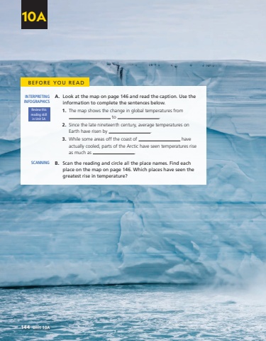 BEFORE YOU READA.Look at the map on page 146 and read the caption. Use the information to complete the sentences below.1.The map shows the change in global temperatures from to .2.Since the late nineteenth century, average temperatures on Earth have risen by . 3.While some areas off the coast of have actually cooled, parts of the Arctic have seen temperatures rise as much as .B.Scan the reading and circle all the place names. Find each place on the map on page 146. Which places have seen the greatest rise in temperature?INTERPRETING INFOGRAPHICSSCANNING144Unit 10AReview this reading skill in Unit 5A