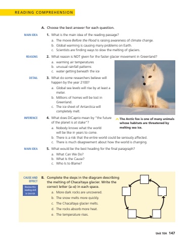 READING COMPREHENSIONA.Choose the best answer for each question.1.What is the main idea of the reading passage?a.The movie Before the Flood is raising awareness of climate change.b.Global warming is causing many problems on Earth.c.Scientists are finding ways to slow the melting of glaciers.2. What reason is NOT given for the faster glacier movement in Greenland?a.warming air temperaturesb.unusual rainfall patternsc.water getting beneath the ice3. What do some researchers believe will happen by the year 2100?a. Global sea levels will rise by at least a meter.b. Millions of homes will be lost in Greenland.c. The ice sheet of Antarctica will completely melt.4. What does DiCaprio mean by %u201cthe future of the planet is at stake%u201d?a. Nobody knows what the world will be like in years to come.b. There is a risk that the entire world could be seriously affected.c. There is much disagreement about how the world is changing.5. What would be the best heading for the final paragraph?a. What Can We Do?b. What Is the Cause?c. Who Is to Blame?B.Complete the steps in the diagram describing the melting of Chacaltaya glacier. Write the correct letter (a%u2013e) in each space.a.More dark rocks are uncovered.b.The snow melts more quickly.c.The Chacaltaya glacier melts.d.The rocks absorb more heat.e.The temperature rises.MAIN IDEAREASONSDETAILINFERENCEMAIN IDEACAUSE AND EFFECTReview this reading skill in Unit 6AThe Arctic fox is one of many animals whose habitats are threatened by melting sea ice. Unit 10A