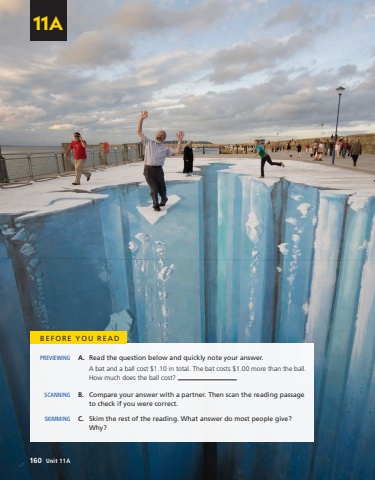 A.A bat and a ball cost $1.10 in total. The bat costs $1.00 more than the ball. How much does the ball cost? B.Compare your answer with a partner. Then scan the reading passage to check if you were correct.C.Skim the rest of the reading. What answer do most people give? Why? PREVIEWINGSCANNINGSKIMMING160Unit 11A