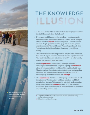 illusion.THE KNOWLEDGEA bat and a ball cost $1.10 in total. The bat costs $1.00 more than the ball. How much does the ball cost?If you answered 10 cents, you%u2019re not alone%u2014most people give the same answer (the correct answer is 5 cents). It%u2019s an example of how we often rely onintuitive responses%u2014answers we feel are true. People give answers that %u201cpop into their mind,%u201d says cognitive scientist1 Steven Sloman. We don%u2019t spend much time %u201creflecting and checking whether the answer %u2026 is right or wrong.%u201dThe bat and ball question helps explain why we often believe in fake news. It is part of human nature to believe, says Sloman. But %u201cthe trick with fake news is to know to verify%u201d%u2014in other words, to stop and question what you know.In one experiment, Sloman and a colleague invented a discovery called helium2 rain. They told a group of volunteersabout it, but admitted they could not fully explain what it was. They then asked the volunteers to rate their own understanding of helium rain. Most volunteers rated themselves 1 out of 7, meaning they did not understand the concept.The researchers then told another group of volunteers about the discovery. This time, they said that scientists could fully explain how it works. When asked to rate their understanding, the volunteers gave an average answer of 2. The scientists%u2019 confidence gave the volunteers an increased sense of their own understanding, Sloman says.ABCDE1A cognitive scientist studies the processes in the brain related to knowing, learning, and understanding.2Heliumis a very light, colorless gas.Unit 11A