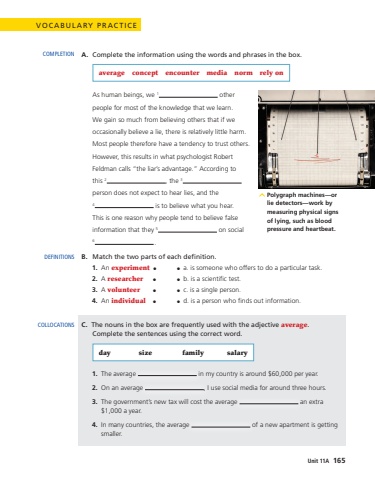 A.Complete the information using the words and phrases in the box. averageconceptencountermedianormrely onAs human beings, we 1 other people for most of the knowledge that we learn. We gain so much from believing others that if we occasionally believe a lie, there is relatively little harm. Most people therefore have a tendency to trust others. However, this results in what psychologist Robert Feldman calls %u201cthe liar%u2019s advantage.%u201d According to this 2, the 3person does not expect to hear lies, and the 4 is to believe what you hear. This is one reason why people tend to believe false information that they 5 on social 6.B. Match the two parts of each definition.1.An experiment%u25cf%u0009%u25cfa. is someone who offers to do a particular task.2.A researcher%u25cf%u25cfb. is a scientific test.3.A volunteer%u25cf%u25cfc. is a single person.4.An individual%u25cf%u25cfd. is a person who finds out information.C. The nouns in the box are frequently used with the adjective average. Complete the sentences using the correct word.daysizefamilysalary1.The average in my country is around $60,000 per year.2.On an average , I use social media for around three hours.3.The government%u2019s new tax will cost the average an extra $1,000 a year. 4.In many countries, the average of a new apartment is getting smaller.COMPLETIONDEFINITIONSCOLLOCATIONSVOCABULARY PRACTICEPolygraph machines%u2014or lie detectors%u2014work by measuring physical signs of lying, such as blood pressure and heartbeat.Unit 11A